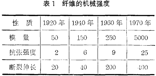 在二十年后的1940年,如表1所示纤维已出现了惊人的改进。这一年,尼龙和人造丝类型轮胎帘布那样真正的合成纤维生产已经开始。另一方面,当时,有一定定向的醋酸纤维已有50%的断裂伸长。进入六十年代后,得到了强度约为10克/旦高模量的聚酯和聚酜胺。