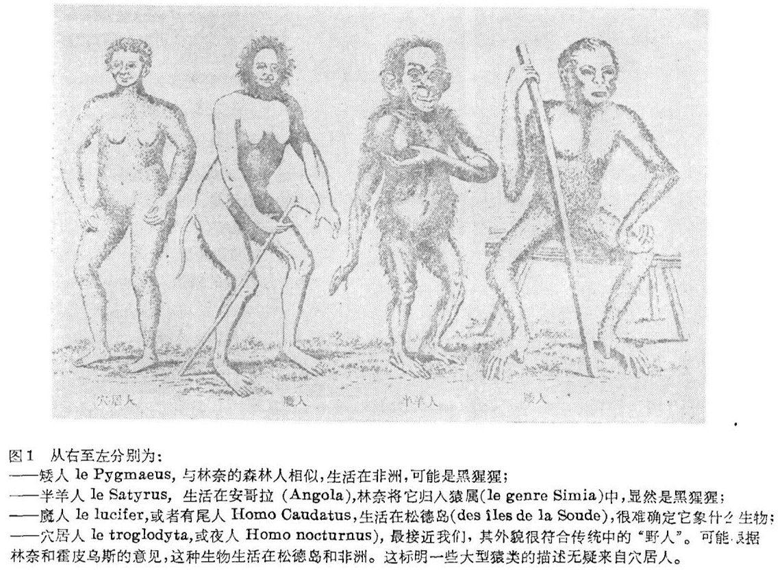 随着文艺复兴时期探索研究的发展,碰见这些动物越来越频繁。但是长期争论着它们的真实性:是极近似动物的人还是一些兽类?解决这个问题需要很多时间。正如温特(H. Wendt)在旅行者札记中指出的那样,大猿与原始部落(非洲俾格麦人Pypmèes africains,锡金的维达人Veddas de Ceylan,尼格利陀人Négritos等)的区别并不很完全。另外,与动物种属的定义相比,人属的定义直到十八世纪还很不明确,而发现大猿迫切需要这样一个定义。十七世纪初至十九世纪初,这个问题的哲学争论不仅基于对大猿不甚充分的解剖学和生活习性的研究,而且还基于对“野人”,即野化人(Homo ferus)、野化儿童——完全是另外一种类型的人——的认识上。当时最著名的“野孩子”无疑是维克多(Victor)-阿维龙野人(le Sauvage del′ Aveyren)和彼得(Peter),后者为汉诺威(le Hauovre)所收容并经蒙波多(Menboddo)和布卢门巴哈(Blumenbach)研究。十八世纪,文明世界之外单独生长起来的野人相当多。在人口密度更低的更早期,他们是为数还要多的生灵,并可能为欧洲的“野人”传说的发展有过贡献。虽然如此,随着对大猿的认识的不断丰富(1699年英国人迪森Tyson就捕捉到了一只黑猿),野人与人类的区别越来越明显。林纳著的《自然系统》的最初几版中,还存在着混淆之处(图1)。但是动物学和人类学的成果并没有完全消除野人存在的信念。古生物学不但揭示了曾存在着一些已经绝灭的人和猿,也为从古至今的各种传说提供了新的依据。最多的消息是关于喜马拉雅山地区的“雪人”,中亚地区的“阿尔玛斯”和太平洋沿岸——美国和加拿大——的“沙斯夸支”。