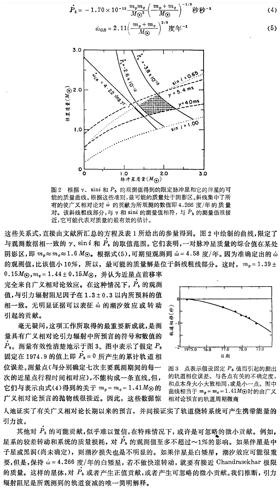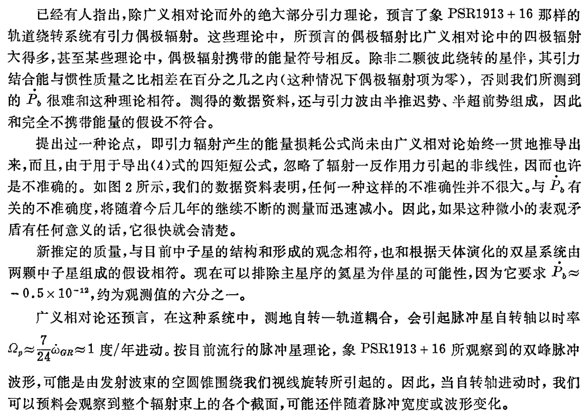 测量脉冲双星PSR1913+16轨道的二、三级相对论效应,得到了脉冲星及其伴星质量的自相一致的估计,定量地证实存在有广义相对论所预言的数量级的引力辐射,并发现了脉冲星自转轴的测地进动。