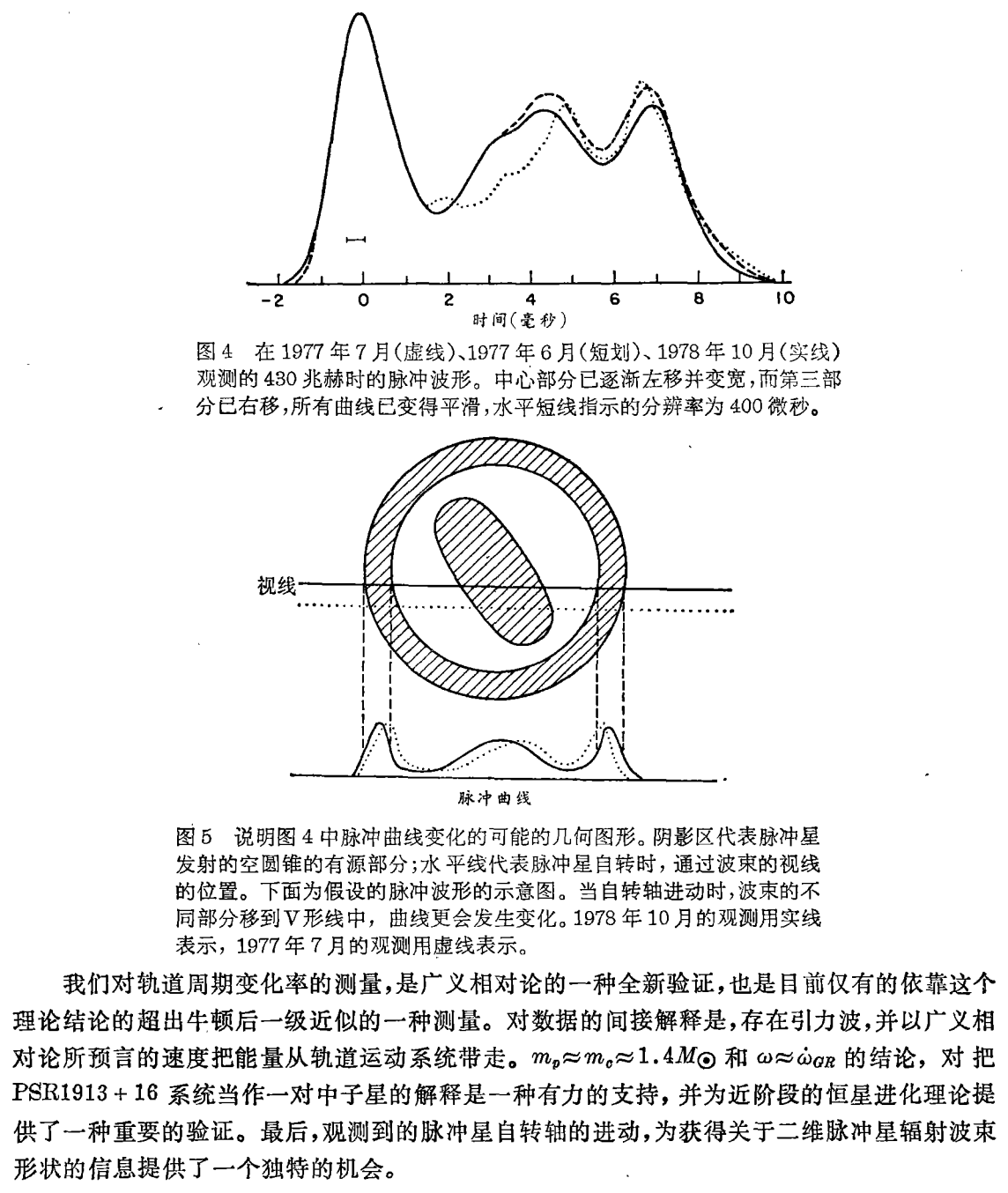 新获得的大多数资料,是来自脉冲到达时间的测量结果。测量观察了近一千次,延续4.1年。用了位于波多黎各的阿雷西博天文台的305米的射电望远镜,频率430和1410兆赫。正常的观测手续:累加约五千个脉冲,使用预先算好的星历表,确定预期的脉动周期。然后,使用最小二乘法,把测得的平均脉冲波形拟合为长期平均“标准波形”,以得到精确的脉冲到达时间。由于1974年到1978年间设备和技术的改进,我们的计时精度逐步提高,由 ~ 1毫秒到 ~ 50微秒。取数据的时间间隔不超过七个月;尽管脉冲周期很短(P=0.059秒),仍能跟踪脉冲星发出的脉冲数目进行测量。