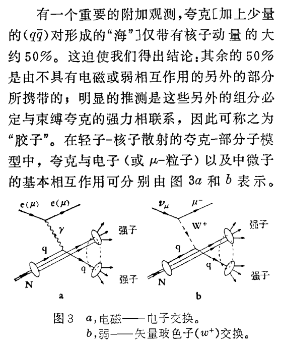 虽然在尽可能最高的能量设法检测出从核子中被击出的夸克的实验都失败了,但是,这些实验在对建立强子结构的可以被接受的图像方面起了重要的作用。特别是在利用轻子作为核子的高能探针方面更是如此,轻子本身显然没有结构,对其相互作用的本性,电子和μ-粒子的电磁力以及中微子的弱力已有很好的了解。