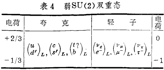 其中θc是混合角,由Cabibbo引入(与b的任何混合都是很小的)。这种结构解释了奇异粒子的被压低了的衰变率(s→u比例于sin2θc ~ 0.06),并且也提供了包括由Glashow Illiopolous和Maiani所建议的粲夸克的一种机制,用于解释к°→μ+μ-的极低的衰变率。