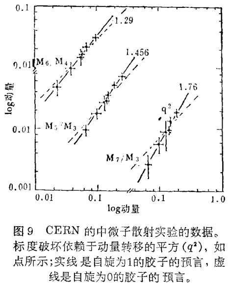 在图8中给出了一阶QCD修正的一些例子。最近在标度破坏方面的实验数据的分析表明,在总的方面与QCD的预言符合得很好。一个例子是Perkins及其合作者利用BEBC和放在CERN的中微子注中的Gargamelle气泡室所做的中微子散射研究。在这个实验中通过观察到的核子中夸克的动量部分分布与碰撞中的动量转移之间的依赖关系,证实了标度的破坏。这个结果在图9中以三组不同的动量对的曲线给出;图中的直线的斜率是由QCD所预言的,与实验数据很好地符合。这个结果表明标度破坏的形式与QCD的预言一致,而且特别是斜率的大小是胶子具有矢量本性的一种证据。