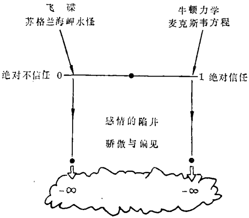 很有可能,人们使珠子靠近一端,实际上根据新材料或新证据等,不论朝哪个方向都有无穷个点可以移动珠子。如果有真正的材料引起你的注意,增强了你对假说的信任,你可以把珠子适当向1移动一下,但是绝不要让它完全达到1点。如果有些材料削弱了你对它的信任,就把珠子向0移动,但也不要完全达到0点。信任程度的变化应该是你对材料、论证或证明等作出独立科学判断的结果,绝不是根据他人的名望或相信同不相信的力量对它而作出来的。爱因斯坦听说将出版一本题为《一万个人反对爱因斯坦》的书,他只说了一句:“一个人就够了!”我自己的珠子,对牛顿力学和麦克斯韦方程非常接近于1,对飞碟和苏格兰海峡水怪物却非常接近于0。但必须强调的是,这都是我的主观珠子,也有些人的珠子对飞碟接近于1,甚至达到超过1,其结果正是我们所要进行讨论的。