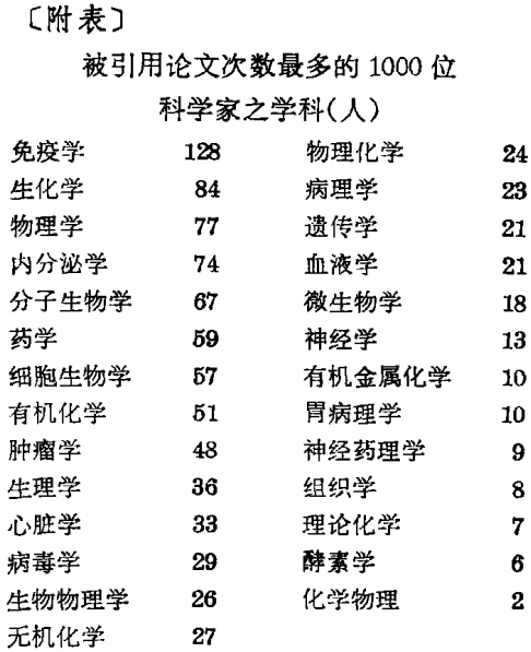 设在美国费城的科学情报研究所,经过二年多的时间,查阅了1965 ~ 1978年之间发表的数目浩瀚的科学论文,从中列出了被频繁引用次数最大的1000篇论文的作者。在他们中间,从事生命科学和物理学研究的科学家为数最多。