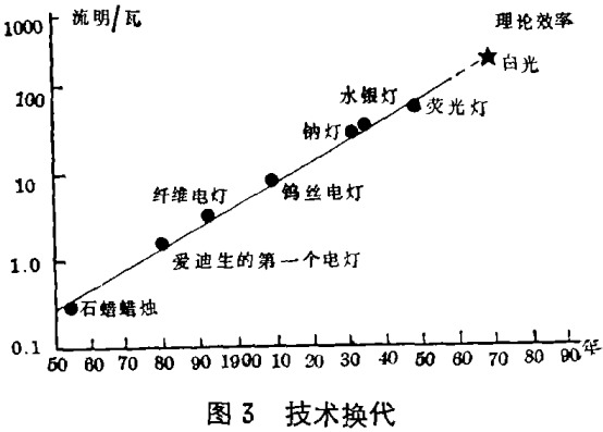图3标出了一系列照明技术达到其最大性能的时间,表明了技术换代的现象。它还显示了可能得到的最大性能。这就是所有能量都转变为光的那一点。不幸的是,并不总是能够显示这一最大点的。