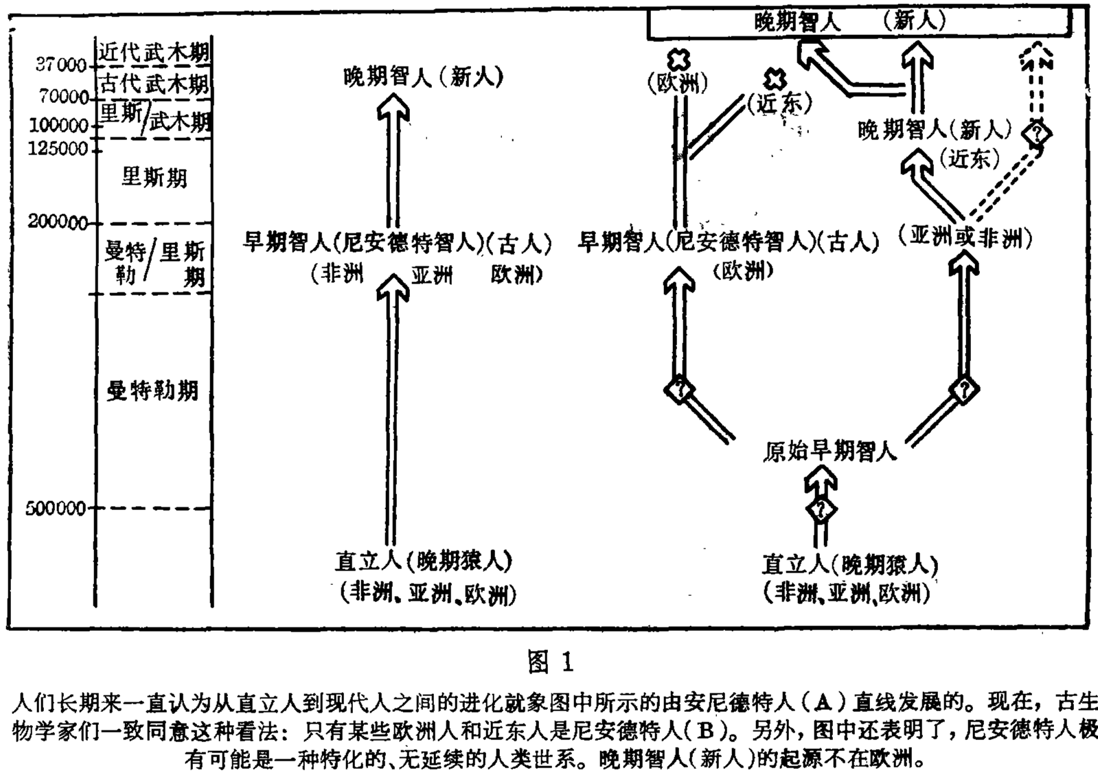 许多人类学家认为最初的早期智人(古人)是直立人(晚期猿人)的后裔,他们是在距今约四十万年前在非洲、亚洲和欧洲等地被发现的。然而,由于存在着二个智人亚种,使现代人的起源问题更为复杂化了。二个智人亚种即为尼安德特智人,一般常称为尼安德特人和晚期智人(新人)。晚期智人被发现于大约四万五千年前,所以他们被看作是人类系统中离现代人最近的人类。至于尼安德特人,问题要复杂得多,有些人类学家长期来一直认为尼安德特人是处于直立人和早期智人中间的环节(图1)。而另一些人类学家的观点恰与之相反,他们对尼安德特人中的一类特殊群体进行了观察认为:这类特殊群体是从尼安德特人系统中演变而出,以后日趋消亡。在这种情况下,就可以认为现代人不是尼安德特人的后裔吗?本文试图对此作出中肯的分析。
