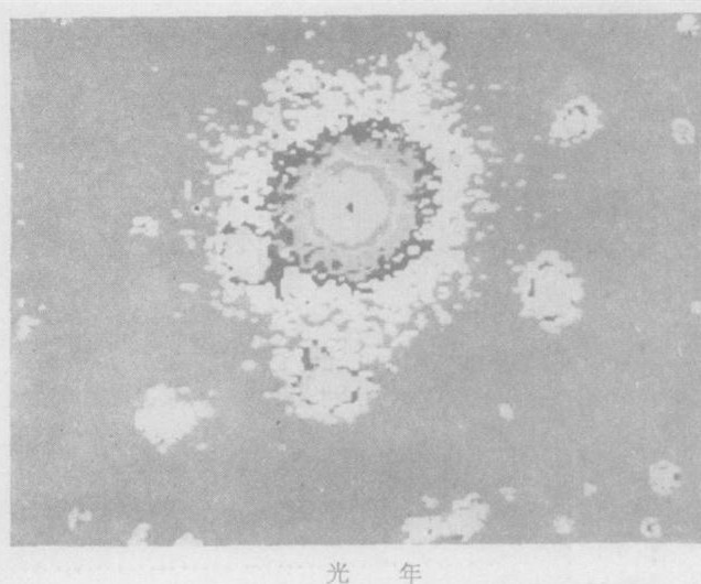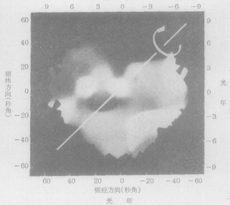 6. 射电望远镜发现的包围银河系中心核的高速回转分子云,轴示银河面的方向。