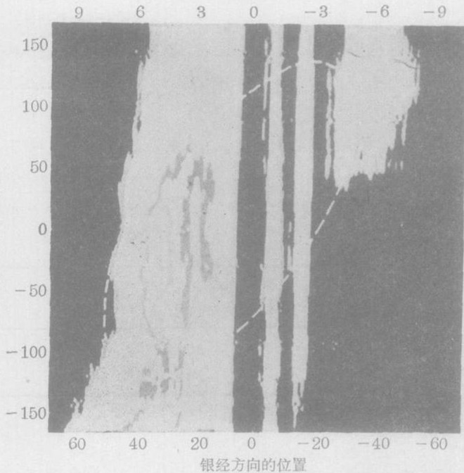 7. 表示空间、速度分布情况的光谱。虚线表示从左上向右下延伸的结构(空间分子云及其吸收影响不计)。