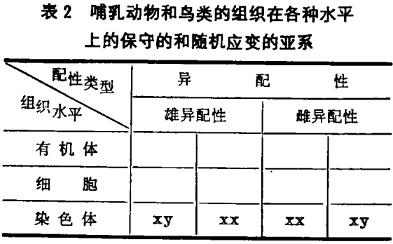 在按配性类型分化的情况下,发生了同样的二者只能取其一的抉择。在“稳定”之前的进化过程中,隐性基因应该用现有的条件进行测交,这种基因测交只有在染色体异配组成(xy)的半合子(不成双的)状态才有可能。这是一种随机应变的趋势,尽管在隐性基因没有出现的同配组成(xx)的情况下杂合基因的组合可以突显保守的趋势。对性别的了解与第一次分化有关,即我们把能够产生小的、游动配子的个体归为雄性,而把可以产生大配子的个体归为雌性。大多数物种的两种随机应变的亚系(小配子和xy结构)出现于雄性,而两种保守的亚系(大配子和xx结构)出现于雌性。这是雄异配性的类型。但是某些物种的这些分化不是这样。雌性的保守的卵细胞与随机应变的异配性结合,而雄性则相反,随机应变的精子与保守的同配性结合,这是雌异配性的类型。因而,第一种类型是合乎逻辑的,而第二种类型是矛盾的。以此能够解释如下事实:如果类型的选择纯粹是一种巧合,而不由性别决定,那么,无论在植物中还是动物中,第一类型的物种都比第二类型的物种多得多。