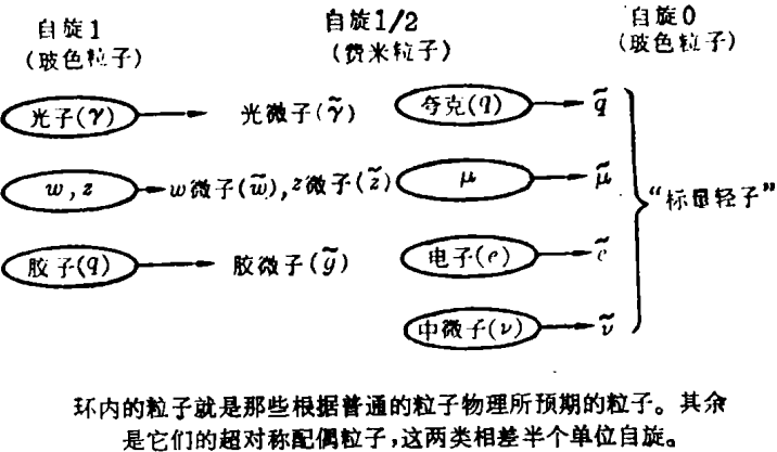 超对称的一个诱人之处是它提出了将粒子归成一类的新方法。以往我们通过这类方法作出了预见并增进了理解;超对称也有这样的作用吗?可以推测,如果超对称量子场论最后也能产生我们今天所理解的弱力和强力的理论,则超对称意味着这些“静通”粒子的配偶粒子存在、它们的一部分列在下面的图表中:
