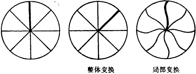 对称变换可以分成两类:即整体的和局部的。在前者,变换是同时应用于所有的点,这可以用圆盘的每一点围绕圆盘中心作相等的旋转图示出来。局部对称变换允许不同的点有不同的变换。在我们的圆盘的例子中,圆形形状由于对称得以完全保持,但是圆盘上每一点以不同的方式被变换了。