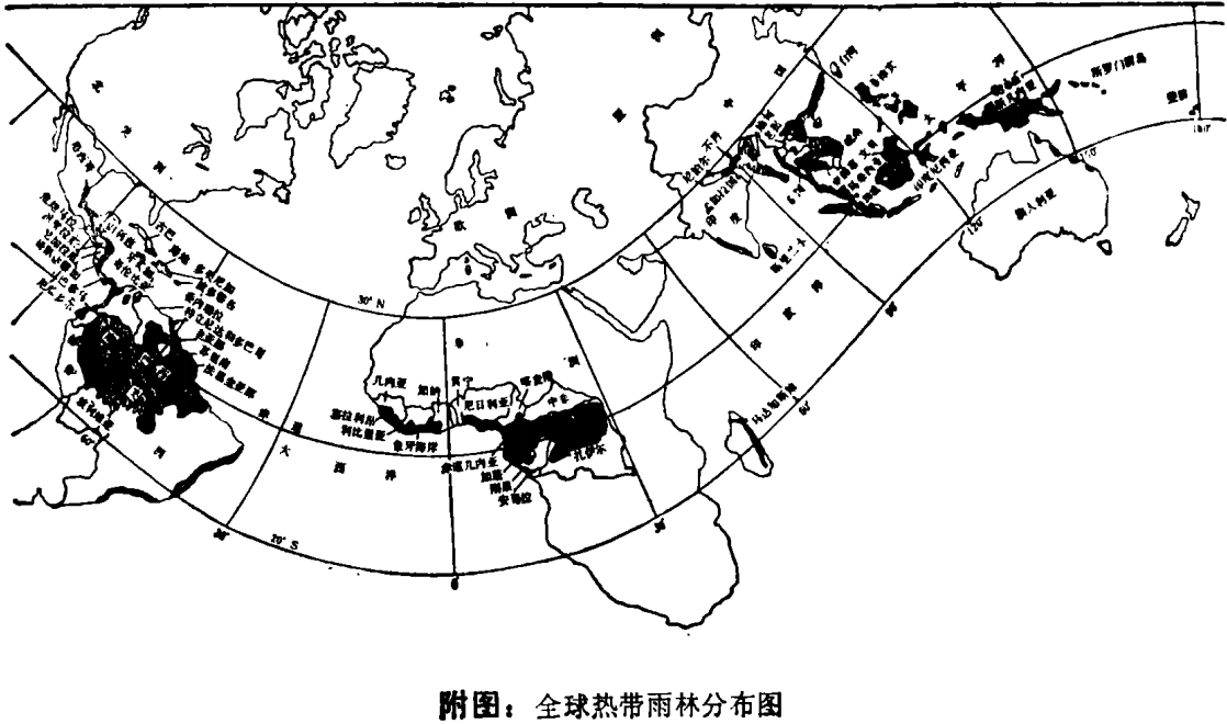 在地球上人迹稀少之处,热带雨林植被呈环状分布在赤道附近的卨温、高湿地区。(见图中黑色部分)。但是随着农业、牧业、伐木、开矿和筑路业的日益发展,已经大大减少了它们的实际分布区域。