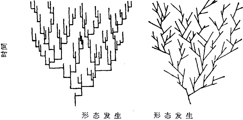 我要考察的问题——“微观进化机制能否外推去解释宏观进化”是准确的。那些强调宏观进化独立性的古生物学家的基本论点是:大尺度的进化不是渐变而是“中断的”。中断平衡模式主张,形态进化是突发性的,并伴有物种形成时期的大量形态变化,结果新种在形态上与其祖先种截然不同,但在其后的几百万年内表型不发生大的变化。而渐变模式认为,形态进化或多或少是一个逐渐变化过程,与物种形成事件无直接联系。可用下图表示这两个表型进化模式。