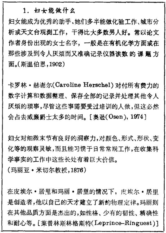 我相信我理解为什么像玛丽亚 · 米切尔(Maria Mitchell)这样成功的妇女也赞同这样的观点,但我认为它是一种可能被人们滥用的危险论点,这种情况就曾发生在玛丽 · 居里身上。1978年出版了罗伯特 · 里德(Robert Reid)撰写的玛丽 · 居里的传记,作者在1981年一封信中写道:“所有可以得到的证据均表明,他们的工作是互为补充的,因而同等分享荣誉是公正的。”但是,妇女只擅长于科学中的“低水平”工作的思想依然存在,理查特为自己《女科学家》一书所写的前言就是很好的例证。