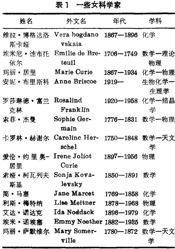 我要称赞那些友好的男人,没有他们的支持就不会有女科学家的存在。众所周知,在英国贝尔纳和布喇格是乐于接收女研究生的。这可能部分地说明为什么英国成功的女结晶学家多得不成比例。高兰德 · 霍普金斯(Gowland Hopkins)一度有过一个研究小组,其中一半是妇女。前面已提到,卢瑟福是一个对女科学家安排周到的人。鲜为人知的是魏纳(Werner)也曾有过一个女研究生,瑞利(Rayleigh)支持过艾格尼斯 · 波凯尔斯(Agnes Pockels),韦尔斯特拉斯(Weierstrass)鼓励过索娅 · 柯瓦列夫斯基,而高斯赞美索菲 · 杰曼是有记载的。顺便要提到的是,莫赞斯(Mozans)曾说她“可能是法国产生的学识最渊博的知识妇女”,但在她的死亡证书中却把她写成是“一个有独立资产的妇女”,而不是一位“数学家”。