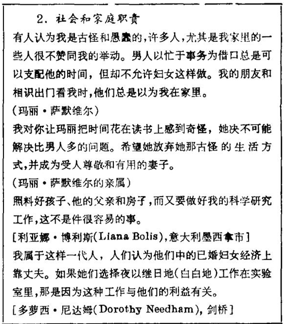 当然,女科学家在这方面遇到的困难和社会的看法同其他任何职业妇女都是相同的。对许多妇女来讲,她们的处境仍然很像玛丽 · 萨默维尔所遇到,见方框2。我的一位女友跟她丈夫一样有一个很需要的职业。但她说:“谁带孩子看牙齿?”一旦家里有什么紧急事,通常都是妻子花时间对付它。照料老人的责任预料也是落在女人的身上,不仅要尽女儿的责任,还要尽儿媳妇的责任。当然,丈夫的态度在此绝对是关键性的。除非家庭收入相当高,足可以让夫妇都不必料理家务,否则做家务就不可避免,在这种情况下丈夫的合作必是不可少的。