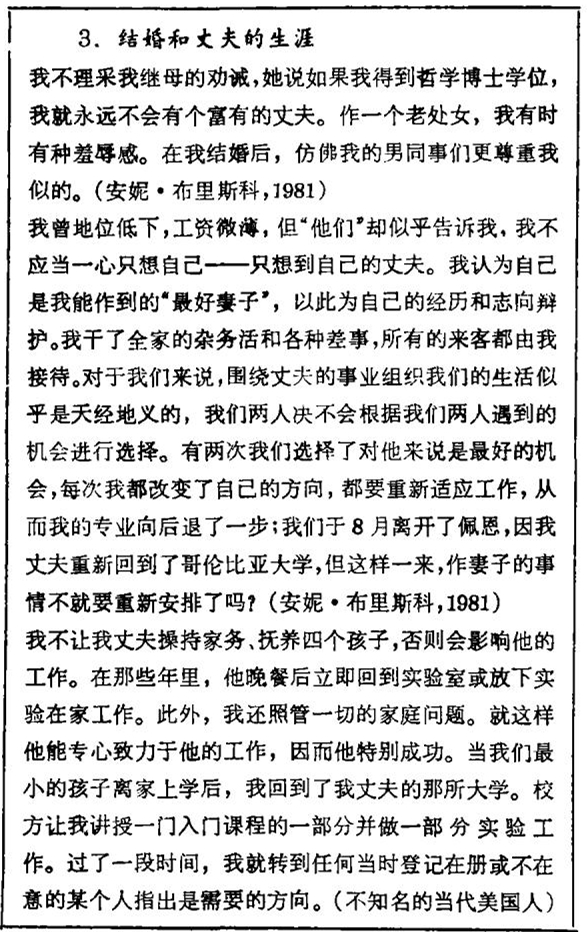 我相信安妮 · 布里斯科的头两条意见(方框3)反映了某些重要而又潜在令人不安的看法。首先我想谈谈“男人并不喜欢聪明的女孩子”。第二条是很有趣的。未婚女科学家叫人难以相处,一旦结了婚,她的同事对她就不会感到拘谨,因为结了婚她就履行了社会期待她应尽的责任之一。