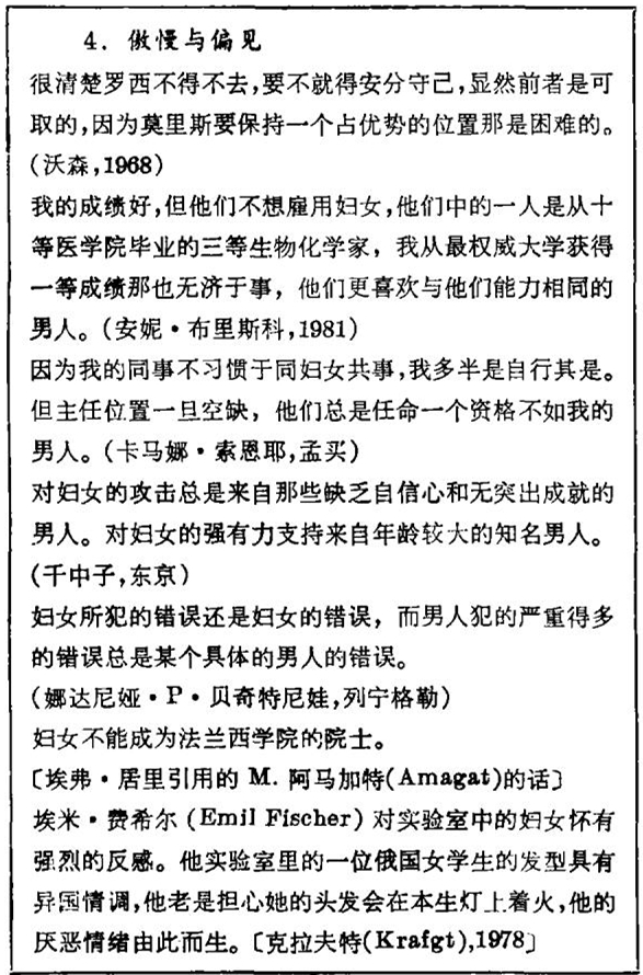 方框4中的第四段引文肯定是真实的。对理科女大学生的支持来自知名的但不一定是年龄大的男人。这方面的情况后面我还要提到。第五段引文提出了同女司机相类似的比拟。如果汽车开得不好,司机又是女的,那么就会说女司机都是不好的,但如果司机是个男的,那人们就会说那个男人(不是指男性全体)开得不好。