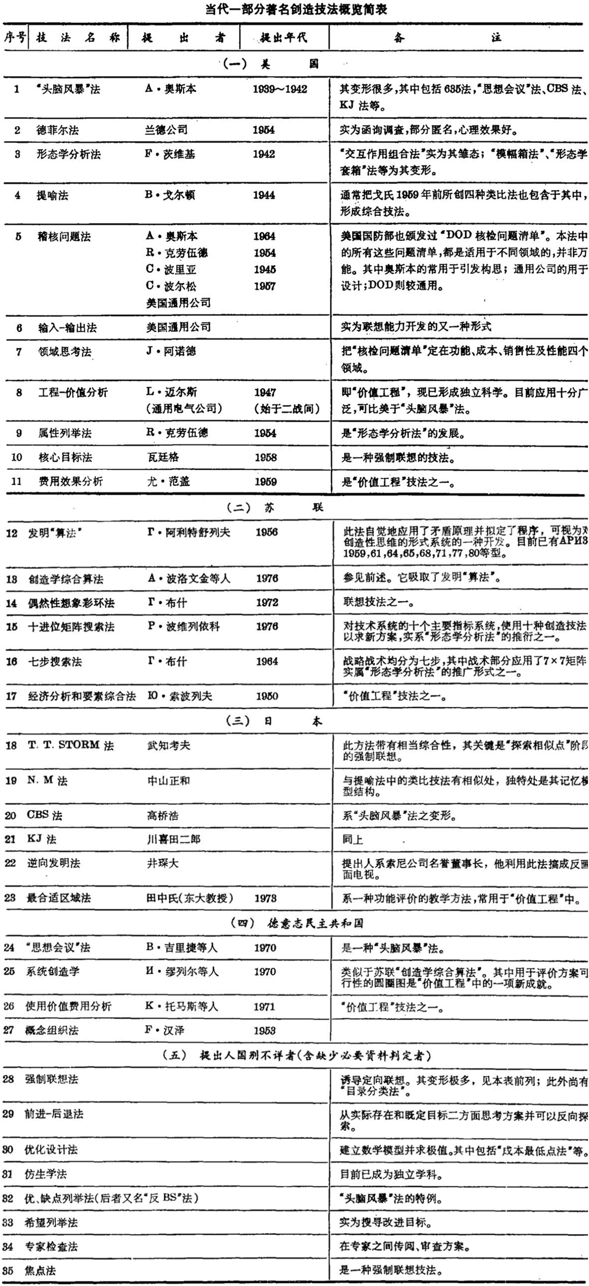 虽然在创造发明活动的实际中,经常出现的情况是发明者事实上利用了各种不同的创造技法并使之“互补”而形成创造的,单独使用某一技法而成功的事情越来越少,但是,作为研究中的理论抽象和在特定时空条件下由特定人提出的技法主体,据说目前世界上较为著名的创造技法也达到数百种,其具体情况见于下表(这个表主要参考了苏联有关教科书中的创造技法概览表①,瑞士V · 胡勃卡博士在1983年国际工程设计会议上发表的论文及其专著《工程设计原理》中的有关内容,以及日美等国的有关资料②编译而成):