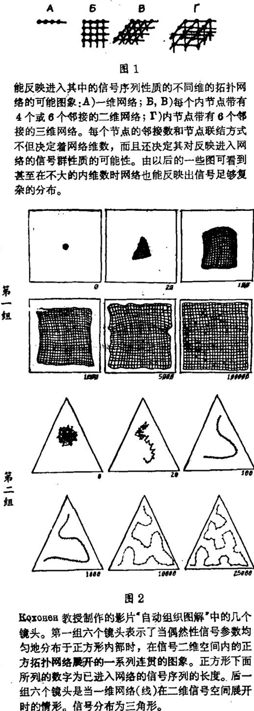 至于涉及到脑功能的算法,则它们(在最低细胞——分子等级)可以是十分简单的。不久前我去听了柯霍南(Т. Кохонeн)教授(芬兰)的报告并看了伴有连接计算机显示器的影片。柯霍南考察了简单的结构,如平方多孔网络,在其节点上有能响应和调整某些符合于它们信号的元件,并按网络产生邻接。开始,这样的网络好像被压缩为一小团——所有元件结构靠近。为一定统计规律所制约的信号长序列自外进入该网络中。受它们的影响,网络开始伸展,最初很快,而后变慢,并获得了(在信号参数空间中)更确切地反映该序列规律性的图形。柯霍南坚持认为人脑实际上是具有确立外界(在我们感觉和经验基础上)的那种简化了的拓扑形式的能力的。
