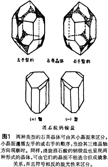巴斯德在巴黎当学生的时候(1843-1848年),就怀疑米兹泽关于酒石酸的报告是不完全的。关于光学活性方面的开拓性工作,当时已针对以两种形式自然地出现在自然界的石英晶体展开。两种形式的晶体可由其小晶面(半切割面)来区分。在一种形式中,半切割面围绕其三维晶轴呈左手螺旋型,而另一种则呈右手螺旋型(图1)。约翰 · 赫尔斯(John Herschel)1922年在剑桥大学发现,自左手螺旋型的任何石英晶体所作的垂直于三维晶轴的切割面对偏振光是左旋的,而右手螺旋型石英晶体相对应的切割面对偏振光一定是右旋的。根据赫尔斯的观点,巴斯德着手研究酒石酸盐——消旋体这一问题。