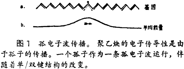 最简单、最熟悉的传导性多聚体是反式 - 聚乙炔,传导性聚乙炔在纯化状态仅很少量地传导电流。然而,掺入极少量别的元素,其导电性大大增加,甚至可达到其他半导体材料的水平。聚乙炔在理论上最具迷惑力的地方是它能传递孤子。Forrest L. Carter已为孤子沿反式聚乙炔链的传递提出了一些较好的理论模型。孤电子是一非线性结构扰动,它动起来像一个粒子,但没有能量损失。这种膺粒子有确定的能量、动量和速度。孤子在水中已被证实。Davydov 1976年提出,按α螺旋传播几千埃的孤子,可能是一种与ATP中键断裂相联系的信号传送机制。孤子在聚乙炔类型的共轭体系中尚未被证明,虽然有许多科学家认为它们确实存在。Carter认为,测量一个孤子绝非易事:用来测量粒子传播速度的“飞行时间”法,依赖于聚乙炔分子中不能有键的断裂,如果键有任何偏离或断裂都会影响粒子的速度。