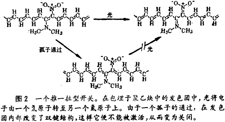 由Carter提出的一种开关机制是推一拉型二烯烃开关(见图2)。将有机的发色团(光敏分子)嵌入聚乙炔链。当光激活发色团时,在分子内部出现电子转移和键的重排。孤子在链上通过也会改变键的结构,从而阻止了光激活作用。孤子就像这样使发色团关闭。这个体系可以很容易地改装成复杂的结构:两个孤子在各自独立的链上传播,激活一个发色团,假如此时开关是“通”,第三个孤子将激活发色团放射出一个光子,以同样的方式便能构建成更杂的(“门”)开关群。Carter估计,靠这一机制能使包装密度达到1018个门/(厘米)3。发色团应要求保持200 ?的间隔(防止“对话”),链应该被包埋在50 ?的中心上。