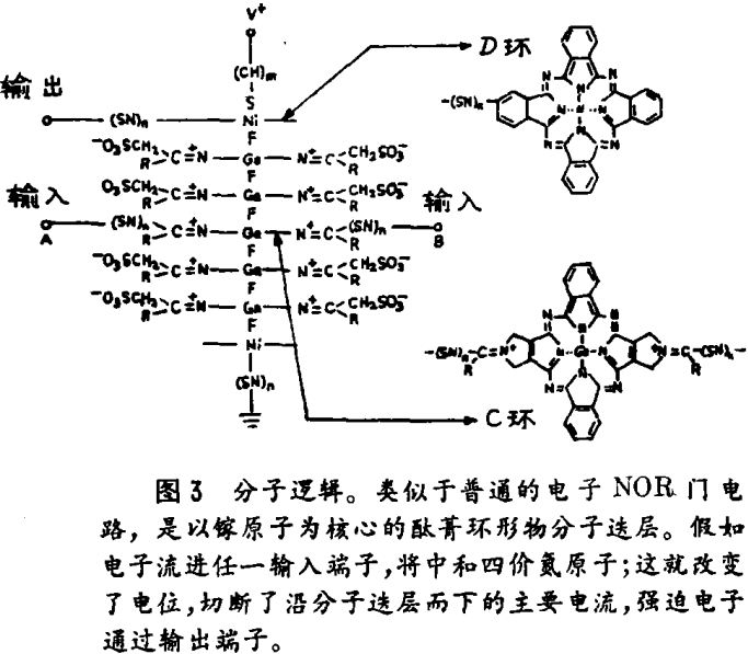 Forrest Carter提供了一个优秀的分子类似物,类似于通常使用的二进制逻辑电路——NOR门电路。这是一种“not/or”运算,即所有输入条件都是不正确,便获得了一个正确的结果;任何输入条件都是正确的,便获得不正确的结果这类型的运算。在具有两个晶体管的NOR线路中,仅当两个输入(晶体管起开关作用)都是断(0)时,输出才是(1)。由电源(Vt)流出的电流将流过输出。假如两个晶体管之一或二者是通(1),电流将流至地线,Carter提供的分子类似物也是建立在通 - 断型开关上,即由电子隧道穿过一组位垒而工作的(见图3)。门电路是镓酞菁环形分子迭垒而成;每个镓通过氟架桥于其他的镓。迭垒分子中的势能井的深度与宽度由四价氮上的正电荷来控制,并且位垒对应于氟桥。在迭层分子中,一个环形物可用聚硫氮化物([SN]x)来代替,它起到一条输入端子的作用。在迭层分子顶部和底部的环形物是镍酞菁。连接镍的多硫氮化物作为另一个端子。电子输入端子是一个聚乙炔分子。电子在任一多硫氮化物导线上运行时,中和四价氮原子,这就改变了电位,也就切断了由迭层分子向地线的电流。这样电流就流向输出端子,使门电路关掉。