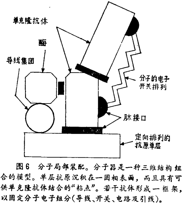 现已提出几种装配学序的设想,其中之一是由Gentron的James McAlear和John Wehrung提出的分子器(图6)。此模型并不是打算作为一种装置,而是为如何组合提供一种手段。这个模型采用单克隆抗体(或其片段)作为高度特异性的组装单位,以建构三维结构。用分子型的电子开关将一个抗体与另一个抗体衔接起来,这样就使信号能在结构内部传递。图中所示导线集团是信息进出口。另一办法是以亚单位作为特异性接合点随机相互接触而在溶液中装配起来。这个结构可像晶体的增长那样增长。由于酶或抗体结合点可精确地相符合,所以装配是自主修饰性的。Kevin Ulmer提出,生物工程技术可用来设计蛋白质。