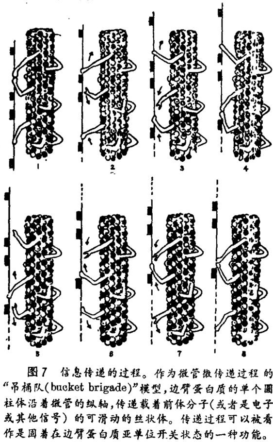 另一个略微不同的生物信息处理方法是用微管作为分子“骨架”。在此,微管被看作是细胞的“自动装置”,即在有组织的栅格结构的生物分子体系中起动力作用。微管构成细胞结构——鞭毛、纤毛、细胞骨架,并在细胞定向,细胞质运动和吞噬中起作用。微管本身由13根纵向排列的原丝状体组成,每一条原丝状体又是由一系列α和β二聚体的微管蛋白构成。微管蛋白二聚体能够自主装配。许多微管结合蛋白(MAPs)可以结合于微管圆柱体的外边。MAPs可以沿着微管的纵轴,以每天超过400 mm的速率传递物质。根据Stutart Hameroff所说,经由一滑动的丝状体单方向传递特定的酶或前体可以被看成是微管蛋白二聚体通一断状态的一种功能,微管蛋白二聚体上固定有边臂蛋白质。假如某一排固定有边臂蛋白质的亚单位是通(占用),而另一排是断(未占用),则边臂指向不相对的“通”亚单位(见图7)。在这个例子中,遗传信息应被看作是一程序表,而变化中的状态(离子流量,电荷梯度,动势)则被看作是执行指令。在每个微管内部,通一断状态提供传导信息的过程。