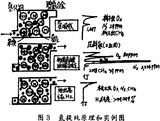 由于贮氢合金具有在混合气体中选择性地吸藏氢的特性,因此这种合金可以用于氢气回收与提纯。如图3所示,使用这种合金提纯氢,可使氢的纯度高达99.999%一般制造高纯氢的方法是采用膜分离法,深冷分离法等,造价高、设备庞杂。使用贮氢合金提纯法看来是完全可以与传统方法相竞争的有前途的新方法。