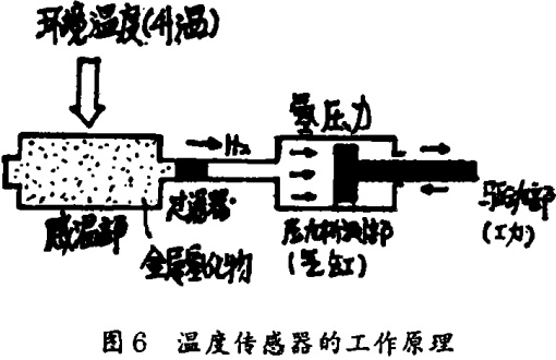 其工作原理与上述传动装置原理一样。即:在密封容器中,以保持合金和氢的平衡状态为条件,巧妙地利用环境温度和与该温度下平衡时的氢平衡压力之间的关系,则可制成温度传感器,如图6。这种传感器的特征是比液体型检测法感温部小,使用温度范围广,不用电负荷。估计今后将会得到广泛使用。