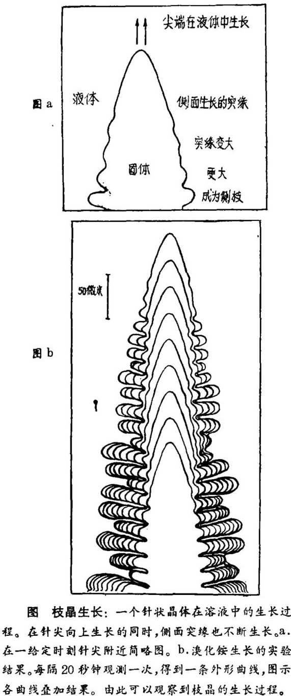 在一个已经确立的物理定律中,又产生出复杂性,其主要原因常常是:对初始条件有很灵敏的依赖性。这种灵敏性可在结晶固体冷却,枝晶生长这一过程中直接看到。在条件适当时,结晶固体会在液体中向上生长,成为针状物,并在外周有突缘,类似于葫芦环(图a、b)。每一突缘都是在固化过程中的不稳定性产生的。突缘开始时在靠近针的顶部形成,其时它们非常之小。随着时间推移,针尖向前移动,而不稳定性便使每个突缘长大。最后,这些突缘形成复杂的形状,具有许多旁枝,好像从侧面把针拉出来一块似的。这些旁枝的高度和位置都很不一样。因为每一个旁枝都是起源于最初在界面上的微观扰动,后来经逐渐放大而成。因此,所观察到的结构的种种变化,都是由于晶体生长时,对生长条件有十分灵敏的依赖性。这种敏感性多次重复,便是自然界复杂性的主要来源。