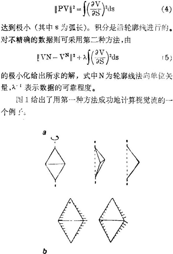 对于正则化分析来说,头等大事是解在物理上的合理性,而不是解的唯一性。对一个问题以及对问题的主要约束所进行的物理分析,在正则化中起着重要的作用。在某些特殊情况下,正则解并不对应于具有实际物理意义的解,这时,为求解不适定问题而作的先验假设就可能被违背。在一些很一般的条件下,式(5)的平滑性假设可以给出正确的解。但是对于某几类运动和轮廓线,平滑性原理却无法产生正确的速度矢量场。人的视觉系统在这种环境中似乎也只能得出同样是不正确的速度矢量场,因此,这种现象有助于我们揭示大脑对外部世界所作的先验假设。
