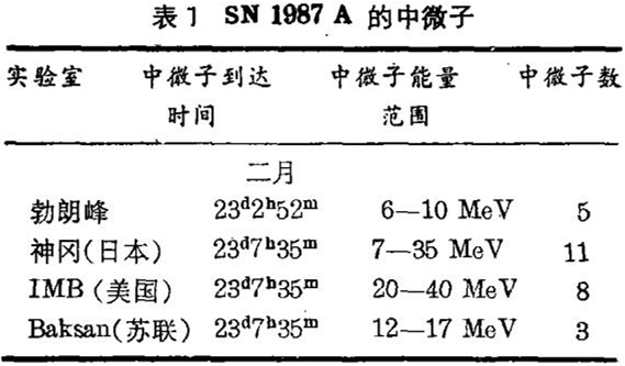 比如,文《Ⅰ》中我们只介绍了一个实验室,即勃朗峰中微子观测站的结果。现在知道,勃朗峰的结果是最可疑的,并不一定是SN1987A的中微子。实际上,在1987年2月23日,有4个实验室记录到了中微子信号。表1列出有关的数据。