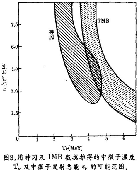 神冈和美国两组数据的反推结果,都画在图3中。其中Tv表示超新星内部中微子的热平衡温度,εv表示超新星发射中微子的总能量。两个暗区分别表示神冈和1 MB所允许的Tv-εv范围。黑区则表示二者的重迭部分。黑区的存在再次表明,神冈中微子与1 MB中微子有共同起源。而且,黑区相应的温度为 ~ 4 MeV,这恰恰是理论预期值。