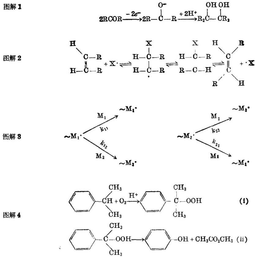 直到1940年代后期,一大批化学家被带进了自由基化学和链式反应性质的研究领域。自由基化学后续发展的大多数基本概念也已经奠定,这些概念中最为有用的是结构和反应性关系的原理。该原理已从梅奥所从事的共聚作用研究中脱颖而出,梅奥在他的分析中假定,生长中的聚合物链的反应活性,主要由自由基生长端的中间体结构来决定。因此,对于两个单体M1和M2的混合物来说,聚合物的组成涉及到四个速率常数(见图解3)。对这种情况的分析导出了共聚物的方程: