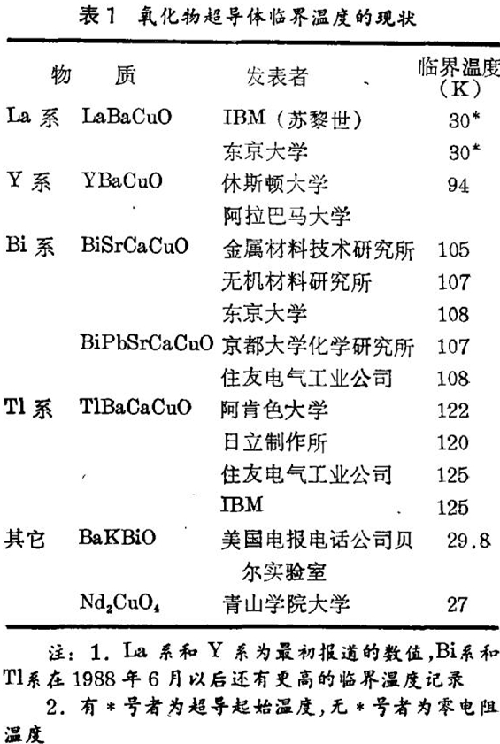 表1列举出了氧化物超导体临界温度的现状,(LaBa)2CuO4报道后,采用其他元素置换这些构成元素的办法,可使临界温度Tc显著提高。Ba由同族的Sr置换制成的(LaSr)2CuO4的Tc为37 K。La由同族的Y置换制成的Ba2YCu3O的Tc超过90 K。将后一种材料中的Y换成稀土元素(Yb,Er,Ho,Dy,Tm,Eu,Gd,Sm,Nd),Tc全都在90 K以上。1988年,又报道了不含稀土元素的Bi-Sr-Ca-Cu-O系列和Tl-Ba-Ca-Cu-O系列超导材料,Tc超过100 K。因为这些材料是用原子价相等的Bi或Tl置换Y并加入与Sr、Ba同族的Ca而成,所以现在可以解释清楚其晶体结构和电子结构,并且可进行单相合成。到目前为止已发现氧化物超导体的晶体结构都具有层状周期结构,单位周期中CuO面的层数与临界温度之间的关系已引起人们注意,这有可能成为提高Tc的途径之—。另外,通过在Bi系材料中添加Pb进行单相化的研究,最近也已得到结果。