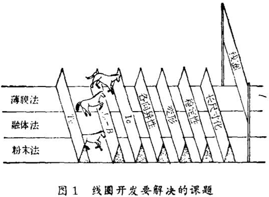 在电力方面的应用必须要开发长尺寸线材或线圈,而高质量超导线材的开发比在单晶基片上形成薄膜更加困难。如果考虑到再现性等因素,块材或线材的临界电流密度目前仍低于5000安培/厘米2。这是由于多晶体中晶粒间界的弱耦合性(第二相析出和不纯物污染等所致)、结晶的各向异性、氧化物的固有脆性等问题而造成的。线材化的方法大致可分为薄膜法、融体化和粉末法。如图1所示,为了得到高质S线材以制造线圈,只有临界温度高是不够的,还必须解决提高在磁场中的电流密度(Jc-B特性)、确保电流容量(Jc)、防止各向异性和变形的措施、长尺寸线材制造技术的稳定性和均匀性等问题。