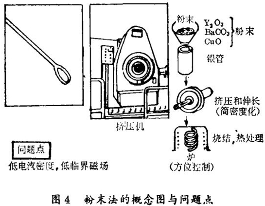 最后,图4示出了用粉末法进行线材化的概念图。这种方法是把原料粉末装在用银等金属制造的套管中进行加工而得到线材。在加工过程中将原料粉碎,线材的纵向与电流容易流过的方向是一致的,因此通过改善加工过程就有可能提高临界电流密度。在液氮温度下,作者用Y系材料已达到了4140安培/厘米2,利用Bi系线材已达到了4400安培/厘米2,但是还没有达到用薄膜法所达到的水平。今后,可能要从晶粒间界控制、取向性、致密化、提高钉扎力、单相化等方面进行改进。与薄膜应用相比,在线材化方面有许多课题尚需深入研究。