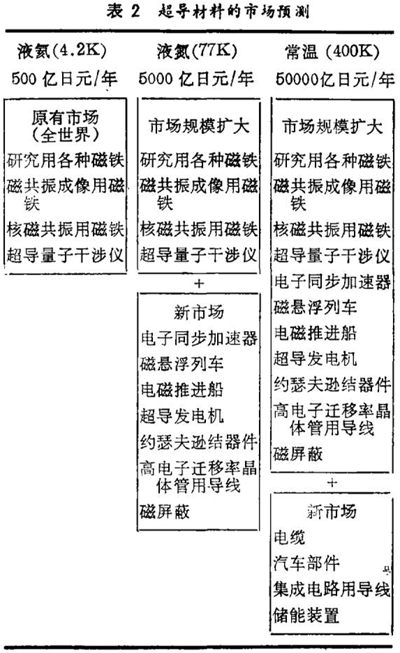 一旦通过上述研究而达到实用化以后,高温超导材料及其制品将对世界市场产生很大影响。表2是作者预想的市场规模。目前在液氦温度下使用的超导体市场,全世界大约在每年600亿日元以下。如果在液氮温度下使用变为现实,会提高一个数量级而达到每年约5000亿日元。一旦室温超导体成为现实,那么市场规模还要提高一个数量级而达到每年5万亿日元。再加上有关制品,市场规模一般还可扩大10倍左右,完全可以形成一种产业。然而,要在产业上取得重要突破,必须开发临界温度更高的超导材料。表3示出了为了开发室温超导体目前正在试验的技术挑战。虽然再现性和稳定性不好,但是不能因此就说完全没有实用习能性。表中Bi和Tl系陶瓷超导体目前达到的具有再现性的临界温度最高值。其他物质的临界温度还要低,有机电荷移动络合物也在继续研究中。