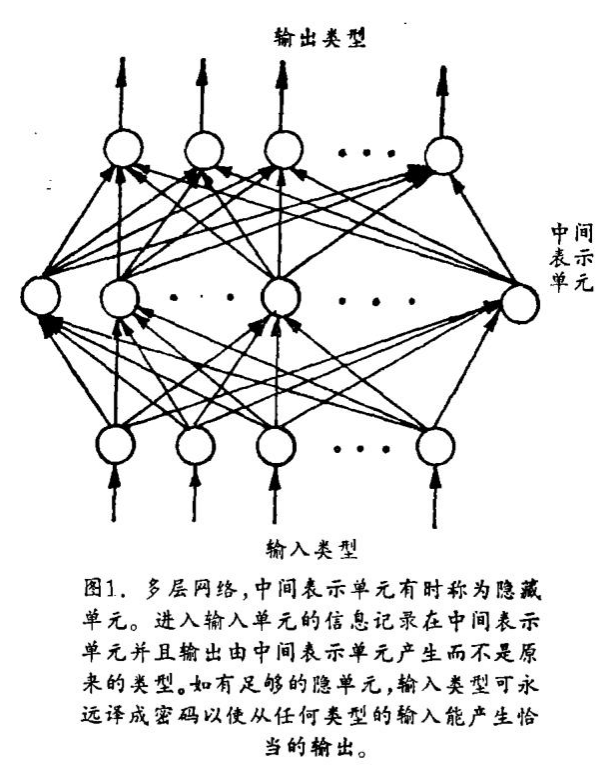 最新的发展主要是出现了能很好地解决这问题的钟规则系统,它的全称为“误差反向传播”,经常被简称作“反传播”,它可用于任意层次,尽管常用的仅三层:输入层、中间层(称为隐藏单元)和输出层,在前两层中的单元直接与上层的全部单元相联系(图1),这里没有反向联系或旁路联系,是一个纯粹简单网络。每个单元形成通常数量的输入并发出分类的输出。