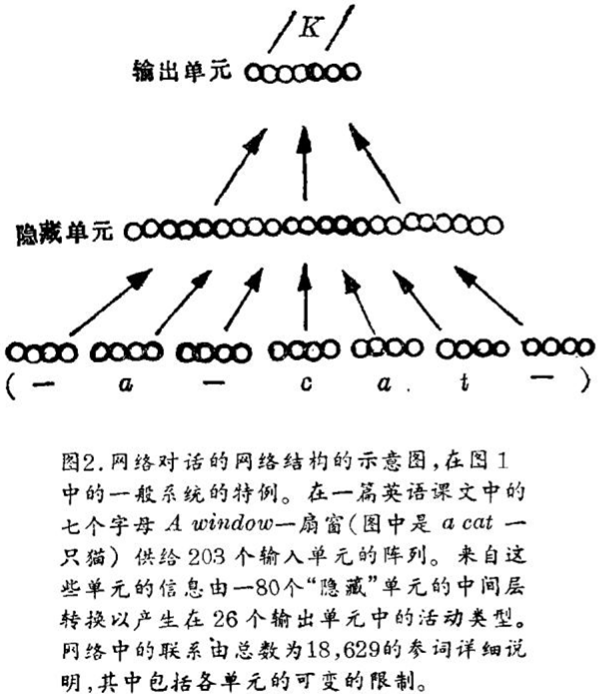 如此简单的网络的使用所产生的结果是令人惊讶的。一个令人注目的例子就是网络对话,作者是赛基诺斯基(Sejnowski)和罗森贝格(Rosenberg),对话的任务是学习英语发音。将一篇英语课文作为输入(图2),输出给一架能产生说话声音的机器。开始,仅作随机的联系,它咿哑学语。逐渐地,随着训练过程推进、它开始说得容易理解了,最后,用一篇它从未看过的课文测试时,它说出相当不错的英语语言,具有大约90%的准确度(由于发音某种程度上取决于英语课文的上下文,而网络不知道其意义,所以绝达不到100%正确)。如此这般,它学会了英语发音的规则。众所周知,仅从例子看这不是直接的而是以心照不宣的方式,尽管规则已经明确地在程序中具体化了。
