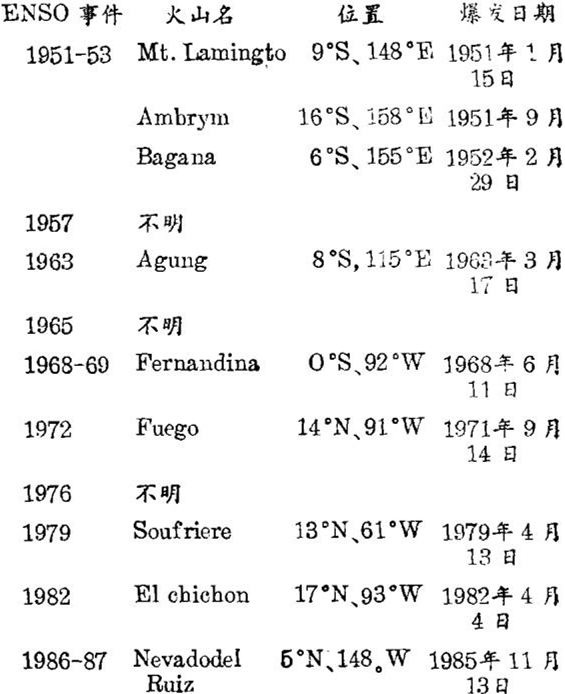 这种火山气溶胶假说对“平均的”和“异常的”ENSO事件都是适用的。Handler的研究表明,热带东太平洋海表温度的升高常出现在低纬火山爆发后的三个月内,并在火山爆发后的9 ~ 15个月内上升到最高值。自1951年以来发生的10次ENSO事件中,有7次是与低纬度火山气溶胶相联系的。由于火山爆发的报告很不完善,所以其余3次ENSO是否与火山爆发有关的情况不明。现将这10次ENSO及其对应的火山爆发列于下表: