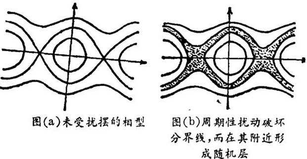 其中ω0为振动的角频率,ε为扰动的参数,而扰动的空间与时间周期分别为2π/R和2π/Q。当摆为自由时,即没有外界的扰乱(ε=0)时,在摆的相平面上有清晰的轨线,它们通过单摆不稳定的上平衡态,后者在相平面中对应的点称为鞍点。这些轨线合成一串相似的橄榄形环(如图(a)),它们把相平面上不同类型(振动与旋转)的相迹分隔开来,所以称为分隔轨线或分界线(separatrix)。它们则既不对应于摆的振动也不对应于摆的旋转。因此,邻接分界线的相空间区域对任何扰动,即使是非常微弱的,都特别灵敏。