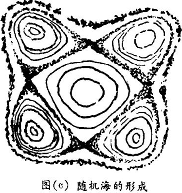 KAM定理的基本结果是,对于微弱的扰动(小的ε)而言,上式所描述的系统的环面虽然有些畸变,但系统的不变环面的大部分还是保存的。这个陈述证明,存在着一些永久稳定的区,在这些区域内浑沌是不可能的。然而也存在着定理的假设失效的一些区域,在那里是可以期望出现浑沌的。数值实验证实了这些预料。在ε<1的弱微扰情况下,KAM定理失效的那些区域被证明就是前面讨论过的随机层。随着ε增大、因冒出邻接的随机层,它们之间的距离消失而使随机层的厚度增加。对某一定值εc,层迭加起来而合并成一个大的随机海。B. Chirik v在1959年提出了这类重迭的条件并作为出现浑沌的一个条件。