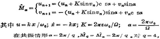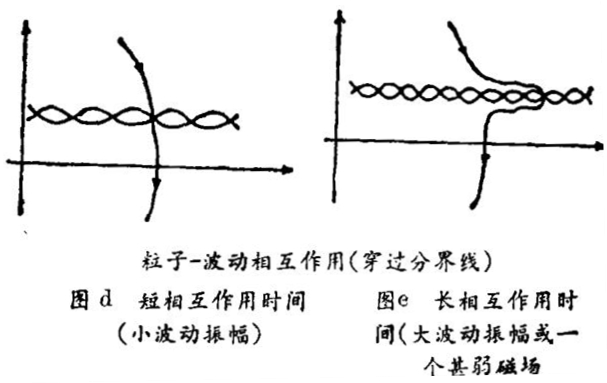 它也可以用来描写在一个沿着z - 轴指向的磁场再加上一个沿x轴传播的平面静电波场内一个带电粒子的运动。此时ω0为迴旋频率。这个方程的问题包含了浑沌的多方面模型,研究起来不是那么容易的、最先是联系等离子体中离子的随机加热来研究的,在相平面上,在磁场内的圆运动轨道穿过平面波的分界线(图(d))。这两类运动在分界线附近强烈地相互作用,有两种极限情形是可能的。可以把每次穿过分界线看作是改变一个粒子的能量和相位的一次“碰撞”。可以证明,若发生了强浑沌,且若满足条件则碰撞时间与迴旋周期相比是短的(图(d))。