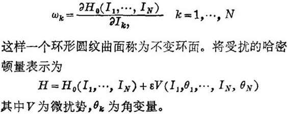 KAM定理,即由Kolmogorov,V. Arnol'd和J. Maser产生的定理。它的基本内容是和有弱扰动的情况下哈密顿体系的独立运动积分的守恒问题相关的。假定未受扰动的系统具有N个自由度,是可积的并且由哈密顿量H0(I1,…,IN)描写。可以将这些作用量Ik选为N个独立的运动积分(不变量)。在此情况下系统的轨线是条件周期的。它绕在一个N维环面上并且由N个角频来表征