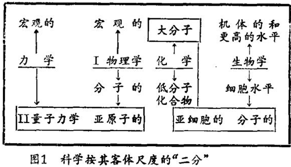 十分重要又很有意思的是现代科学按其研究的客体的尺度的“分裂”(参见图1)。在恩格斯时代还没有这种分裂。物理学上甚至还赋予微观粒子(分子)和宏观物体以同一类型的力学规律性,古典力学仍保持原样,即宏观物体的力学;量子力学也保持原样,即微观物体的力学(量子力学不是旧意义上的力学),物理学上的新意是物理学“分裂”为宏观客体物理学(Ⅰ)和微观客体物理学(Ⅱ),这是物理学“从下面”增建的结果。